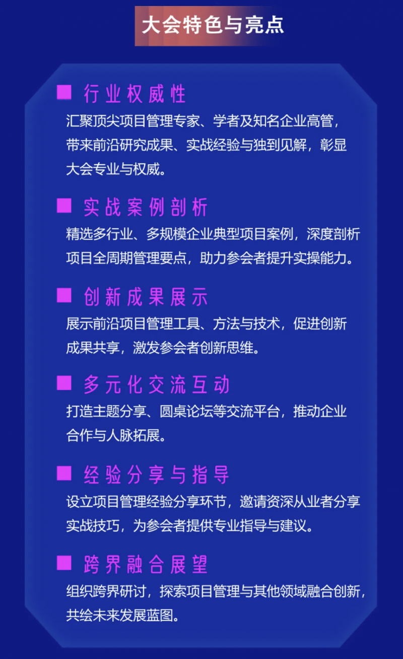 1. 行业权威性 :汇聚顶尖项目管理专家、学者及知名企业高管,带来前沿研究成果、实战经验与独到见解,彰显大会专业与权威。