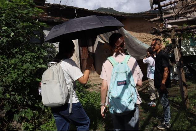 7月23日,在老沈的带领下,团队踏上龙坑3号与7号的青石台阶,队员们记录下斑驳的门板、锈蚀的门环等古民居遗存信息。随后,攀登状元岭过程中,队员们观察并测绘了通京驿道的走向,对古道保护现状进行记录。通过一整天的实地走访,团队初步掌握了鹅峰村红色文化与历史古迹的分布情况,为后续调研与整理奠定了基础。