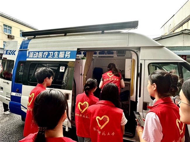 为响应“健康中国”战略号召,推动优质医疗资源下沉基层,2025年7月29日与7月31日,杭州师范大学公共卫生与护理学院“悦康同行”暑期志愿服务团队深入杭州良渚街道社区卫生服务中心下属服务点,全程参与5G+健康共富直通车实践活动。团队成员以专业素养协助移动医疗服务开展,用青春力量为基层健康事业添砖加瓦,以实际行动诠释新时代青年的责任与担当。