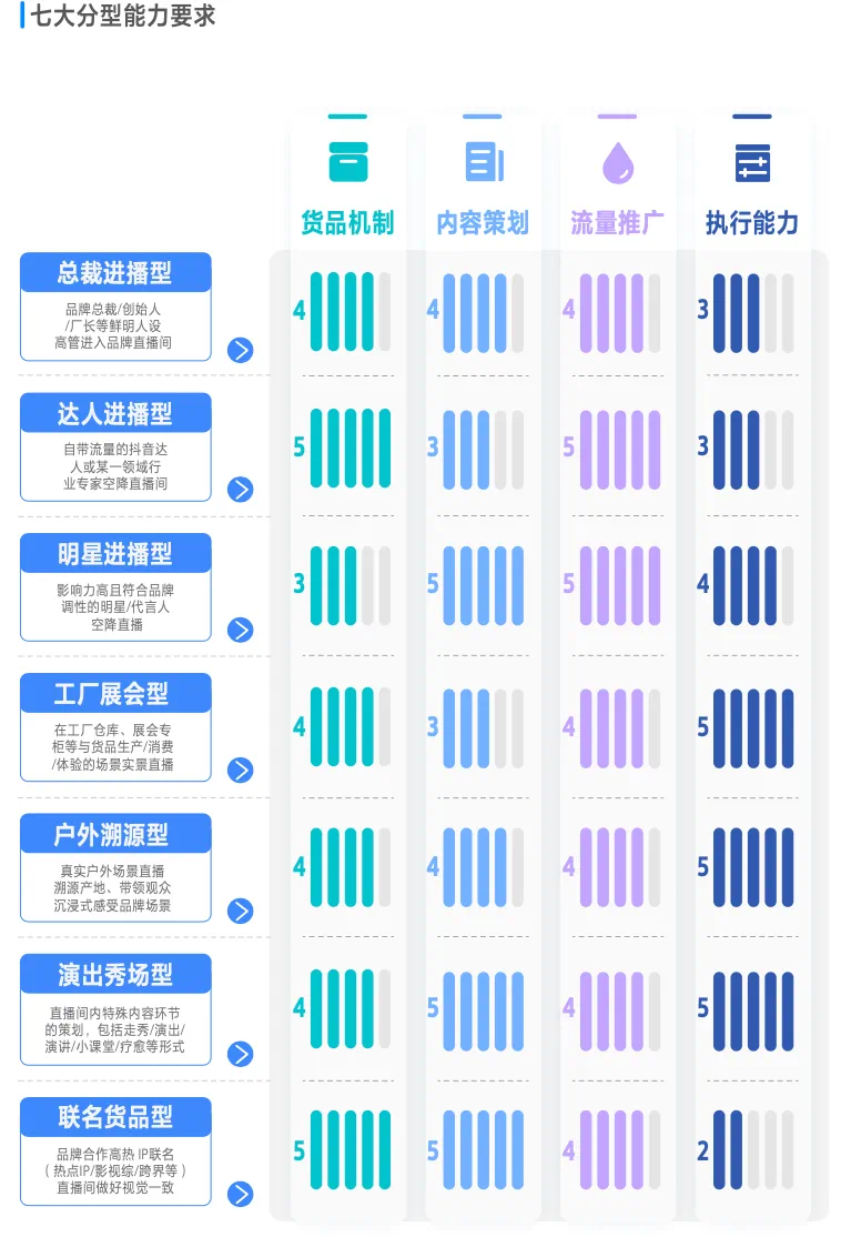 锁定心智方向后,需要选择适配的直播间范式。不同类型的直播间,应用在不同行业会有差异化的表现,与此同时,商家自身的能力模型也需要与品牌直播间相对应和组合。