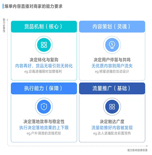 需要强调的是,一场成功的「爆单内容直播间」,仍然要看商家的“基本功”:其中,内容力是核心,流量力是杠杆,货品力是基础,执行力是保障。