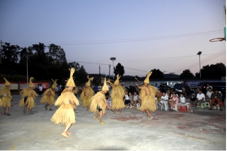 晚会现场,毛古斯舞、土家山歌、打溜子与青春歌舞串烧交织碰撞。老人们身披稻草衣,以毛古斯舞复刻远古农耕,每一步踏地都藏着土家人与土地共生的故事;毛古斯是土家族原始文化的“活化石”,也是土家族古老、古典的原始戏剧。其精华之处聚“歌、舞、剧”三者一体,具有研究土家族文化历史价值。表演者身穿稻草衣,头戴草帽,赤脚露腿,手舞足蹈。剧情由女毛古斯领头(即女王)从乱石中飞跃而出,众人随后从不同位置呐喊着出现在女王周围,并随女王改变队形走圆场,跑八卦,祭祖先。