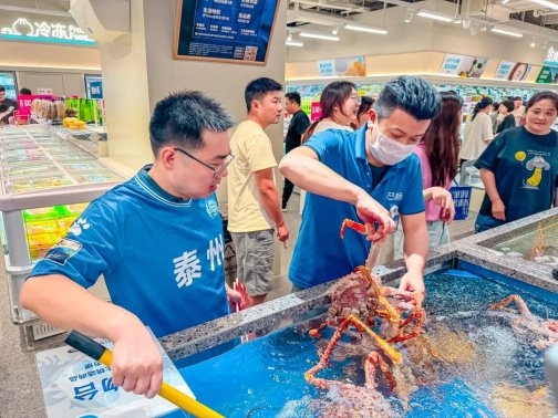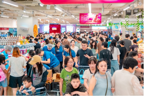 采访人员在开业现场看到:日日鲜牛奶9.9元、14.9元话梅菠萝云雾绿茶、49.9元一盒榴莲千层蛋糕、599元一只俄罗斯冷水金帝王蟹……现场市民热情高涨,不少货架被消费者买到“断货”,门店工作人员正在抓紧补货。