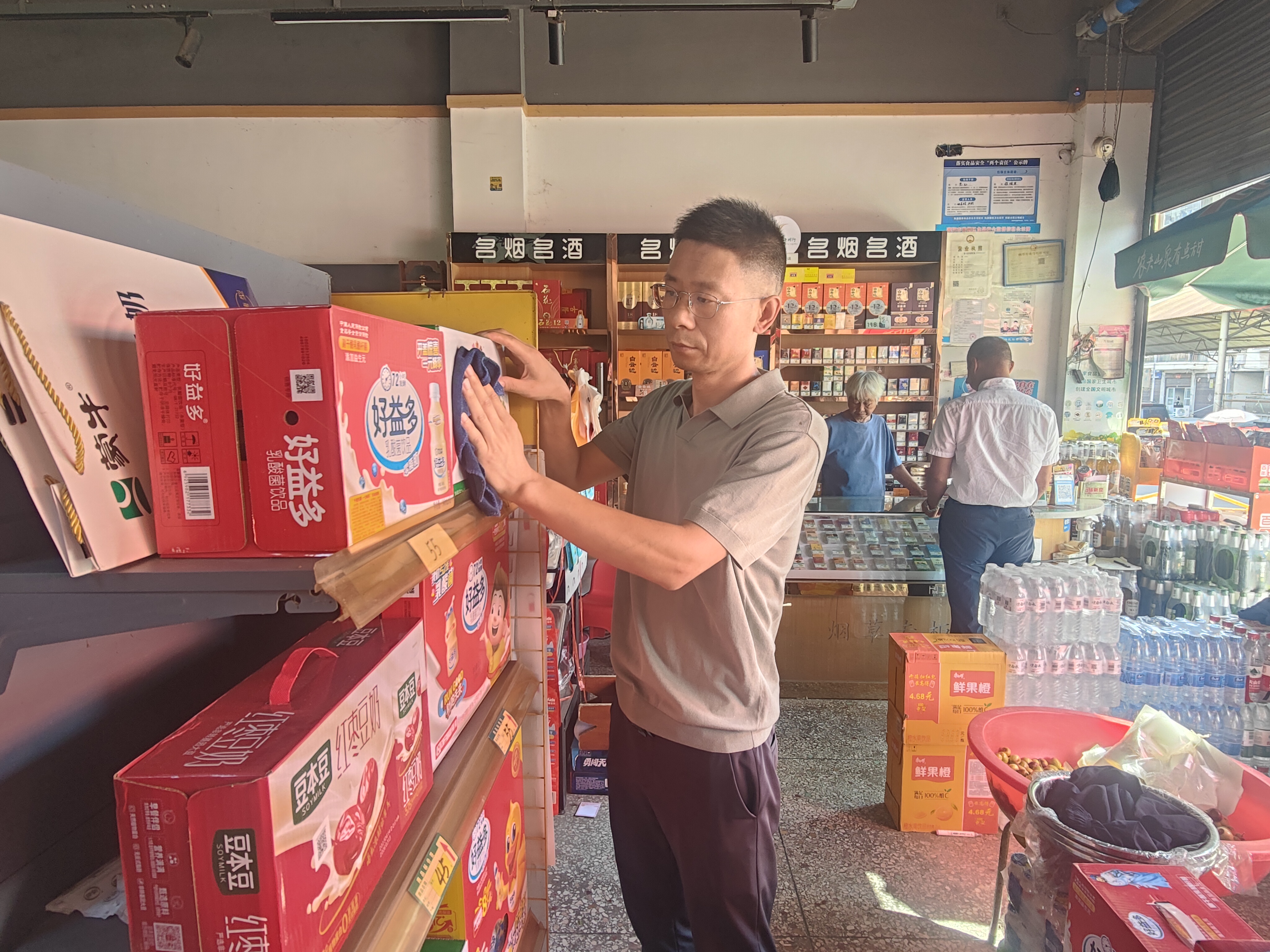 (图为:杨国胜为老年零售户程焕英擦拭商品灰层)