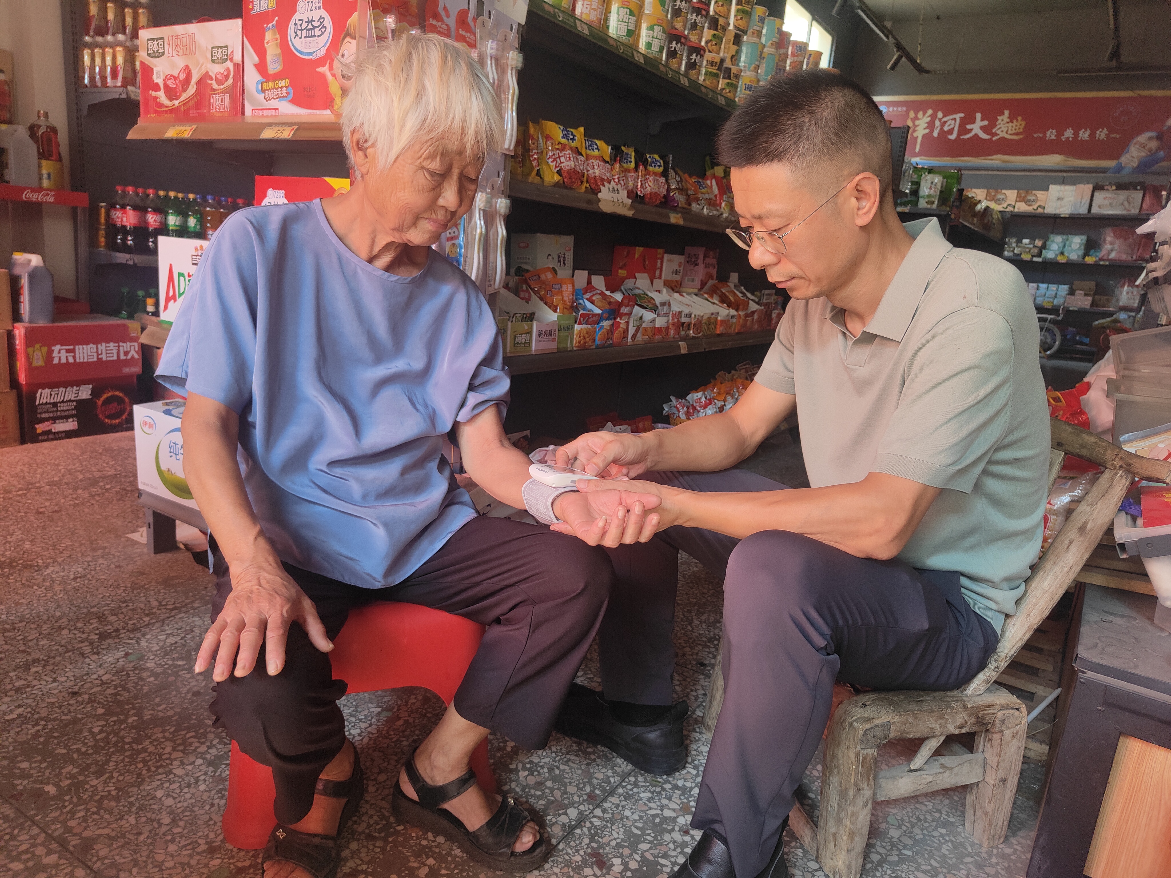 那是2018年的夏天,太阳炙烤着大地、空气中散发着热浪。程焕英蜷在柜台后,头晕得像要休克。货架上的商品东倒西歪,地上散落着几个空纸箱,药味混着霉味在小店里打转。突然门帘一掀,带着生机进来个穿短袖的年轻人:"程大娘,我是黄集市场部的杨国胜,来看看您,您怎么了"。边说边急忙把程焕英扶坐在椅子,并从包内拿出了随身携带的血压仪,细心地给她量血压。量完血压后,他急忙说:程大娘您的血压有些高,需要吃降压药。”“我的降压药已经吃完了”,听完此话,杨国胜急忙奔向药房给程焕英买来降压药。气喘吁吁地说:“程大娘您平时吃的是这种药吗?”程焕英看了一眼药瓶点了一下头,有气无力说“是的”。吃完药后,程焕英恢复了平静。见她有了好转,杨国胜松了口气说:“程大娘您要注意身体,去医院检查一下”。他边说边帮助程焕英整理货架,货架整理好后他才发现已到中午,赶忙向程焕英道别。