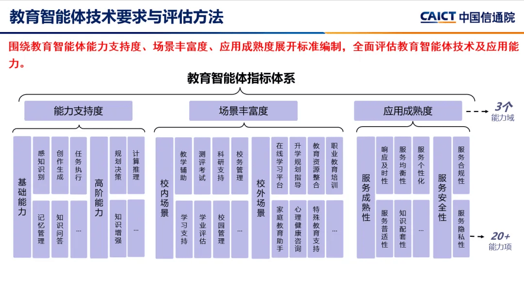 教育智能体评估围绕能力支持度、场景丰富度和应用成熟度,为教育智能体在基础能力、高阶能力、校内场景、校外场景、服务成熟度以及服务安全性等方面提供规范与指导,具体要求如下: