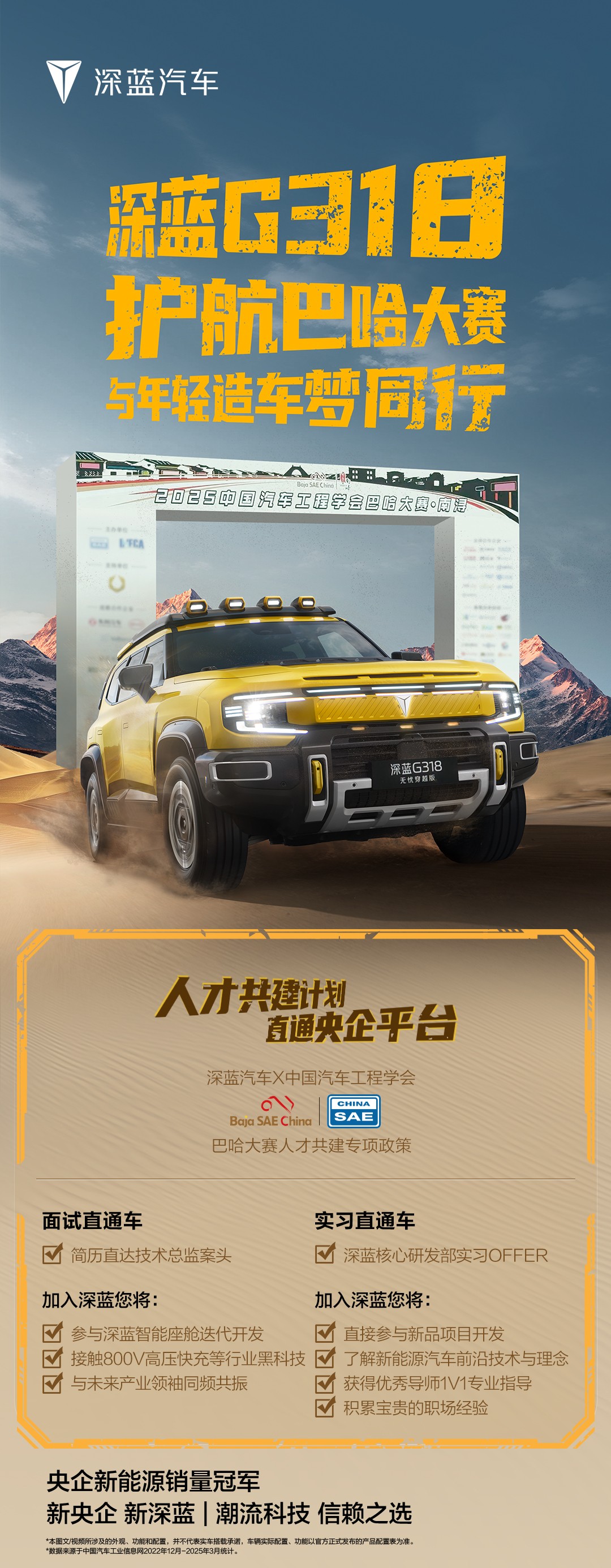 2025年中国汽车工程学会巴哈大赛将于8月19日至24日在浙江南浔举办。作为国内极具挑战性的小型越野赛车设计制造竞赛,自2015年引入后,以“实践育人、挑战极限”为核心理念,通过多项实战项目考验车队能力,十年已培养近3万名复合型汽车工程人才,推动了产教融合与行业数字化转型。此次大赛中,深蓝汽车将携深蓝G318无忧穿越版全程助力,凭借硬核越野性能与智能化技术全程提供支持,助力人才培育,践行“新央企”使命。