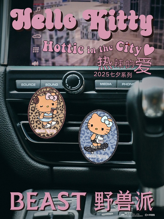 豹纹小爱心,闪闪惹人爱。野兽派×Hello Kitty七夕黑皮系列推出身体香氛喷雾与车载香氛,是又甜又酷还香香的的Hello Kitty,在出行时刻与身体护理的日常中陪伴你!