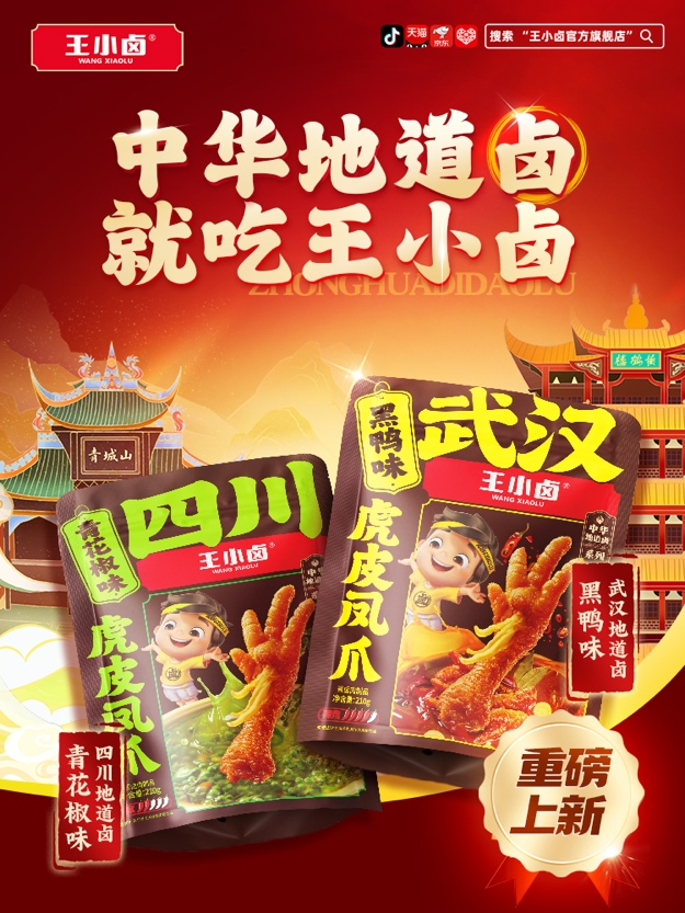 一款虎皮凤爪做出10种风味不是上限。作为凤爪专家品牌,王小卤深挖中国博大精深的卤味文化,洞察地域美食特色,加速产品矩阵拓展,近半年重磅推出筋肉紧实又入味的老卤凤爪、老卤鸭掌;寻觅全国各地宝藏地域风味,重磅上新“中华地道卤”系列产品,推出武汉黑鸭味与四川青花椒味虎皮凤爪;凭借其在卤味工艺上的探索创新,还推出红油虎皮凤爪、脆笋去骨凤爪等多款人气新品。通过口味和工艺的不断突破,持续满足市场多元化需求,王小卤已经勾勒出更清晰的国民凤爪品牌版图。