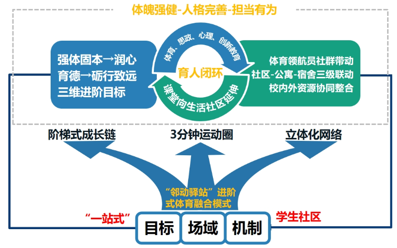 中国海洋大学管理学院面对学生体质健康水平参差、心理抗压能力薄弱、实践创新动能不足等育人难题,以“强体·润心·砺行”进阶式育人为轴心,创新打造“邻动驿站”体育融合育人模式,构建三级进阶式路径:目标上贯通“强体固本-润心育德=砺行致远”阶梯式成长链,破解体质、心理、素质发展割裂问题;场域上推动体育育人从课堂向生活社区深度延伸,打造“3分钟可达”的泛在化运动场景;机制上建立“体育领航员社群带动、社区-公寓-宿舍三级联动、校内外资源协同整合”的立体化网络,实现育人力量与资源精准下沉。通过体育与思政、心理、创新教育的深度融合,形成“体魄强健-人格完善-担当有为”的育人闭环。