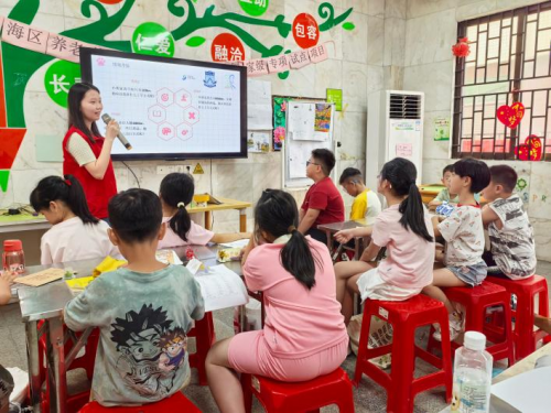 理论课堂上,突击队队员们通过生动的情景模拟和互动问答,把环保知识讲“活”。“如果学校就在家附近200米,我们该怎么去上学?”队员以日常生活为切入点,引导孩子们思考步行、骑行等绿色出行方式的环保意义。在垃圾分类的有关课堂上,孩子们通过卡片投递游戏,学会了区分可回收物、有害垃圾等类别。此外,突击队还借助“时光放映机”讲述华南虎、朱鹮等濒危动物的故事,让孩子们在共情中理解生物多样性保护的重要性。