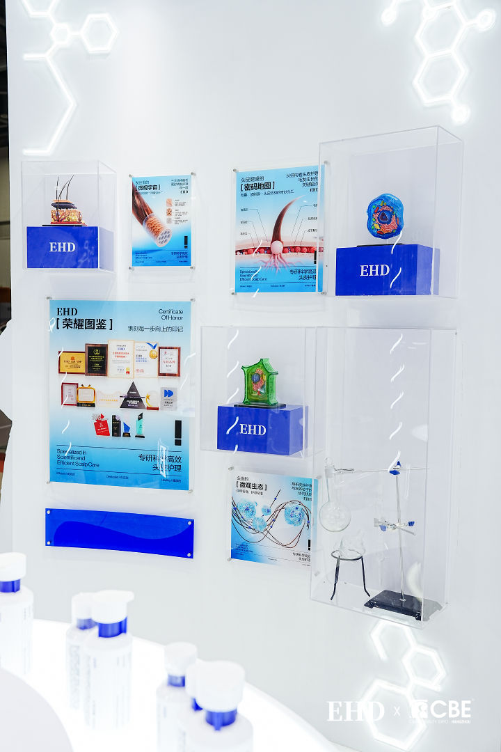 为让理念可视化,EHD 在展会展台打造了一面生物科技艺术装饰墙。墙面上,头皮结构、动物细胞、植物细胞等微观元素以艺术化形式呈现,将抽象的生物科技转化为直观的视觉体验,既展现了品牌的技术底蕴,也传递出科技可被感知的人文温度,成为展会现场的热门打卡点。