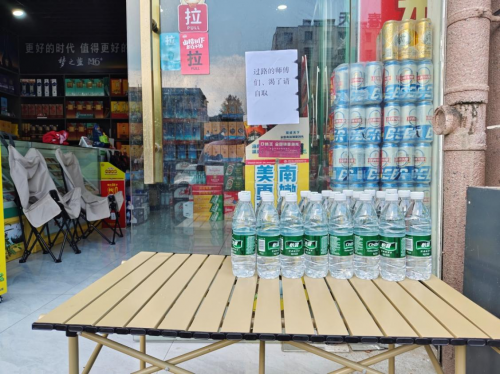 一个宽大的遮阳棚,一张桌子配上几个小板凳。冰柜里冰镇的矿泉水码得整整齐齐,门口新添的小桌案上,冰镇的矿泉水正冒着丝丝凉气,旁边的玻璃门上贴着一张打印字条:“过路的师傅们,渴了请自取。”
