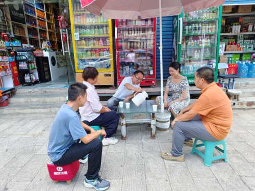 夕阳西下,暑气渐消。严玉红的店铺前,凉茶桶又添了新的茶汤,冰柜的冰饮发出细碎的碰撞声,几个老主顾坐在‘清凉驿站’里,一边喝茶,一边和严玉红聊着家常。