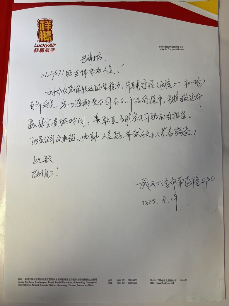 航班上,旅客写下一封感谢信,对祥鹏航空在此次人体器官转运过程中提供的支持和帮助,为挽救生命赢得的宝贵时间表达敬意和感谢。
