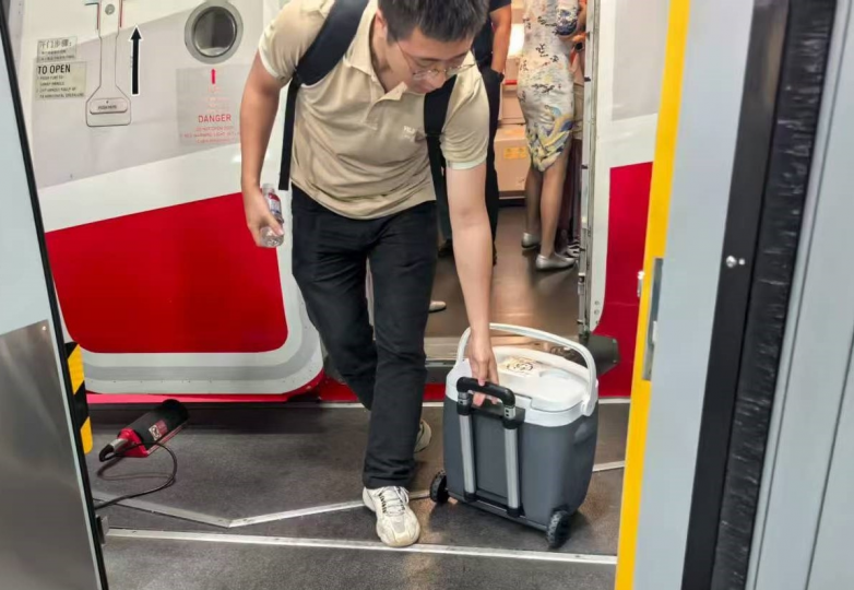 16:03左右,携带人体器官的旅客在工作人员的引领下顺利登机。早已在舱门口等待的乘务员,立即安排旅客就座,协助旅客妥善摆放和固定随身行李。