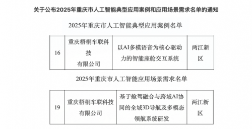 近日,重庆市经济和信息化委员会公布2025年重庆市人工智能典型应用案例和应用场景需求名单,梧桐车联科技有限公司(下文简称TINNOVE梧桐科技)凭借在智能网联新能源汽车领域的技术创新实力及旗下全栈式AI座舱解决方案品牌TTi,成功入选“典型应用案例”和“应用场景需求”双项名单,实力展现公司在人工智能与智能座舱融合发展的领先优势。