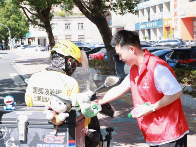 行至城东街道的人行道,见几位环卫工人顶着烈日作业,热得汗水直往下淌,志愿者们立刻放缓车速,快步上前,将冰镇和常温的矿泉水逐一递到他们手中,并关切道:“工作辛苦了,这些水您拿着降降温、解解渴。”