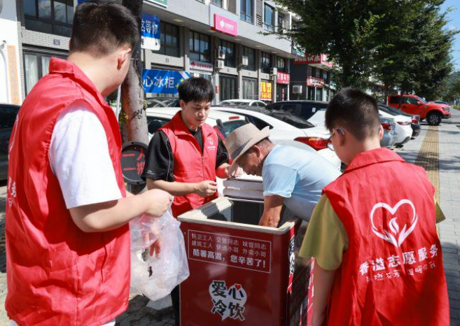 志愿者们的首站,是市区一处爱心冰柜。这些散落于街边、公交站点旁的爱心冰柜,是户外劳动者随取随用的“清凉应急站”,需要及时补充、维护。他们拉开冰柜门,将整箱矿泉水整齐码放,又俯身仔细查看冰柜温度,确保每一瓶饮品都始终透着冰凉,这一番“清凉补给”行动,让爱心冰柜得以持续发挥“清凉接力”的作用。