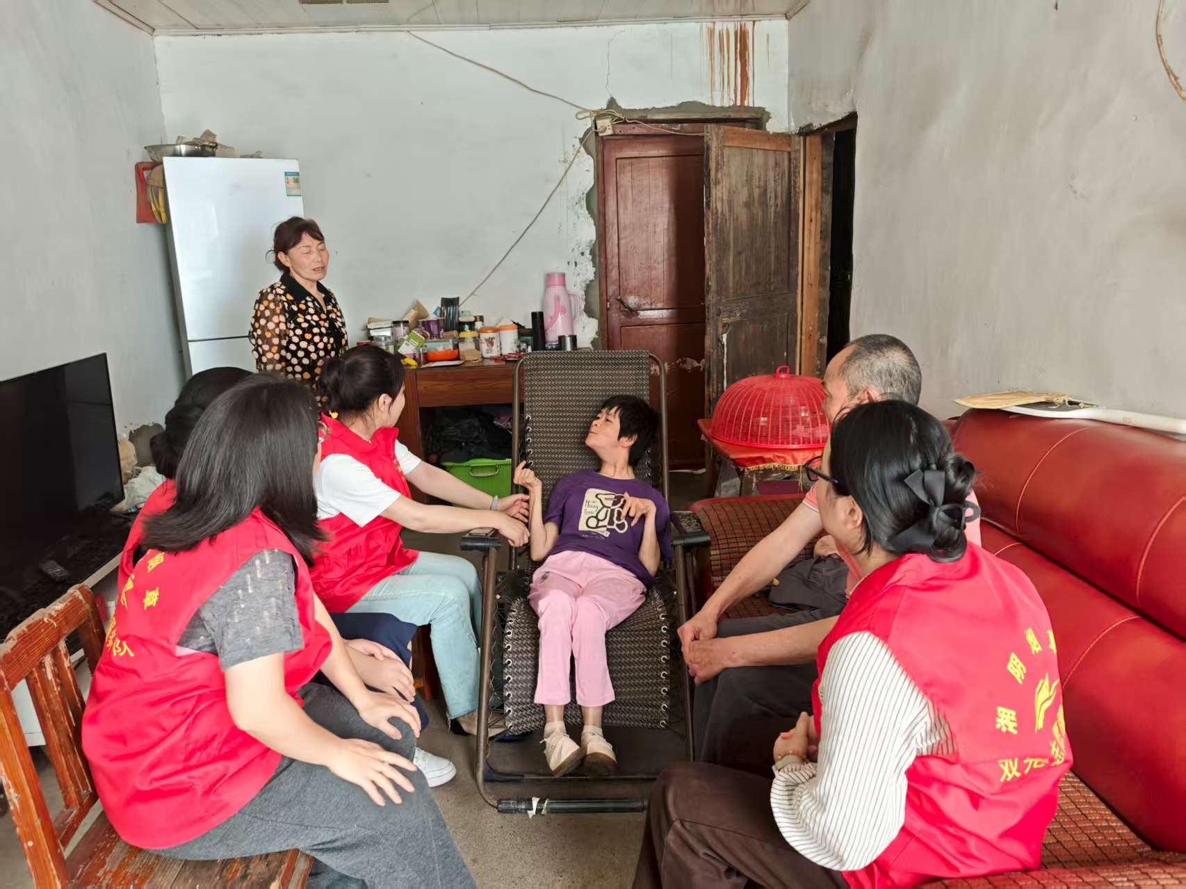 (图为志愿者到家中看望阳霞)