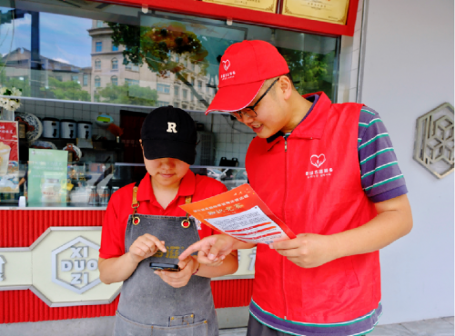 图为“香溢”志愿者指导奶茶店员通过线上答题了解法律知识