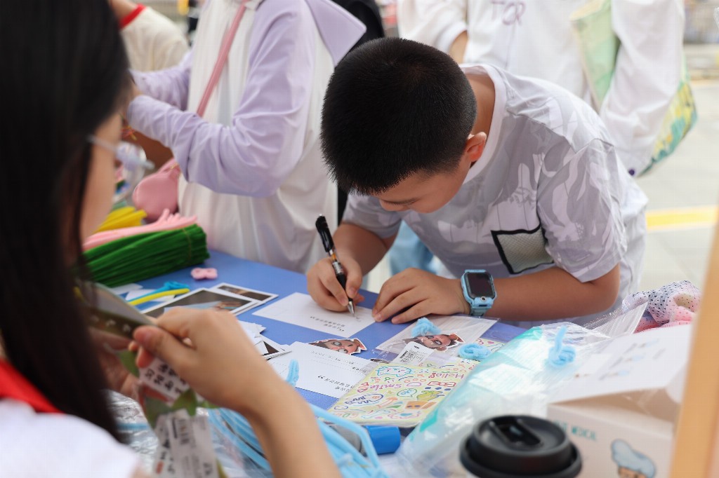 在志愿者的引导下,孩子们还用稚嫩的笔触在明信片上写下了“早日康复”“每天开心”等温暖的话语。这些卡片将承载着最真挚的祝福,为正在与病痛作斗争的住院患儿们送去同龄人的鼓励。孩子们亲手按下的五彩手印更是汇聚成一股无形的力量,推动着“花开各季,童心同行”团队不断前行。