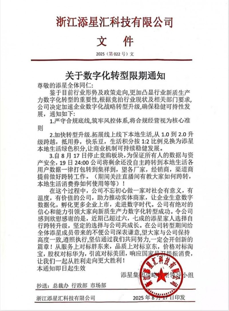 近日,浙江添星汇科技有限公司正式对外宣布,为实现企业可持续、合规化、高质量发展,公司将全面进行战略转型升级,由原有业务模式系统迭代为“添星生活2.0”本地生活生态板块。这一重大转型不仅是企业应对当前经济环境与政策导向的主动选择,更是其布局新质生产力、深度参与实体经济数字化转型的关键一步。