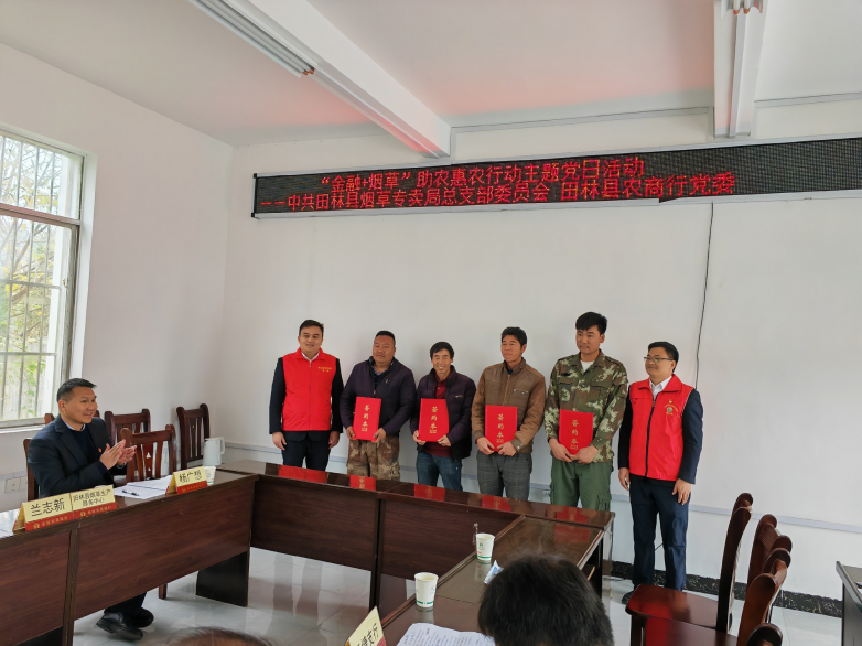 为帮助烟农重拾信心、恢复生产,田林县烟草专卖局(营销部)党总支牵头,联合田林县农村商业银行党委、田林县烟草生产服务中心开展党建共建,创新推出“党建+金融+产业”帮扶模式。三方党组织多次召开联席会议,针对烟农资金短缺、技术薄弱等痛点制定解决方案:由田林县农村商业银行开通“金叶贷”绿色通道,简化审批流程、降低贷款利率,为种烟农户提供专项信贷支持;田林县烟草专卖局(营销部)和烟草生产服务中心则组建党员技术服务队,全程提供技术指导,确保烤烟生产“种得好、烤得优”。