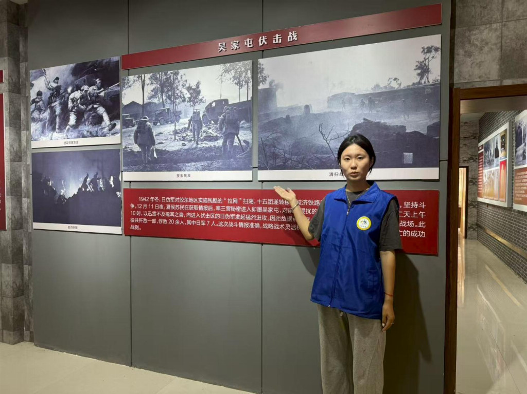 参观过程中,大家始终保持庄重的态度,不时在笔记本上记录关键信息,遇到疑问及时向讲解员请教。当了解到夏侯苏民烈士在战斗中身先士卒、多次负伤仍坚持指挥,最终为掩护战友壮烈牺牲的事迹时,张祎梁难掩激动之情:“革命先辈用生命换来今天的和平生活,我们必须铭记这段历史,学习英雄精神,传承红色传统。” 作为艺术专业学子,张祎梁在参观中特别关注纪念馆的红色文化传播形式。她注意到,馆内通过场景复原、多媒体展示等方式增强历史的感染力,但在视觉艺术呈现方面仍有拓展空间。这一发现让她对后续即将开展的墙绘创作充满责任感,更加坚定了用艺术形式赋予红色文化新内涵的决心。