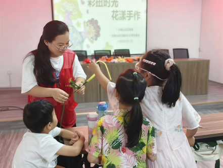 向阳花护航队志愿者在扭花手作课堂中与孩子们互动