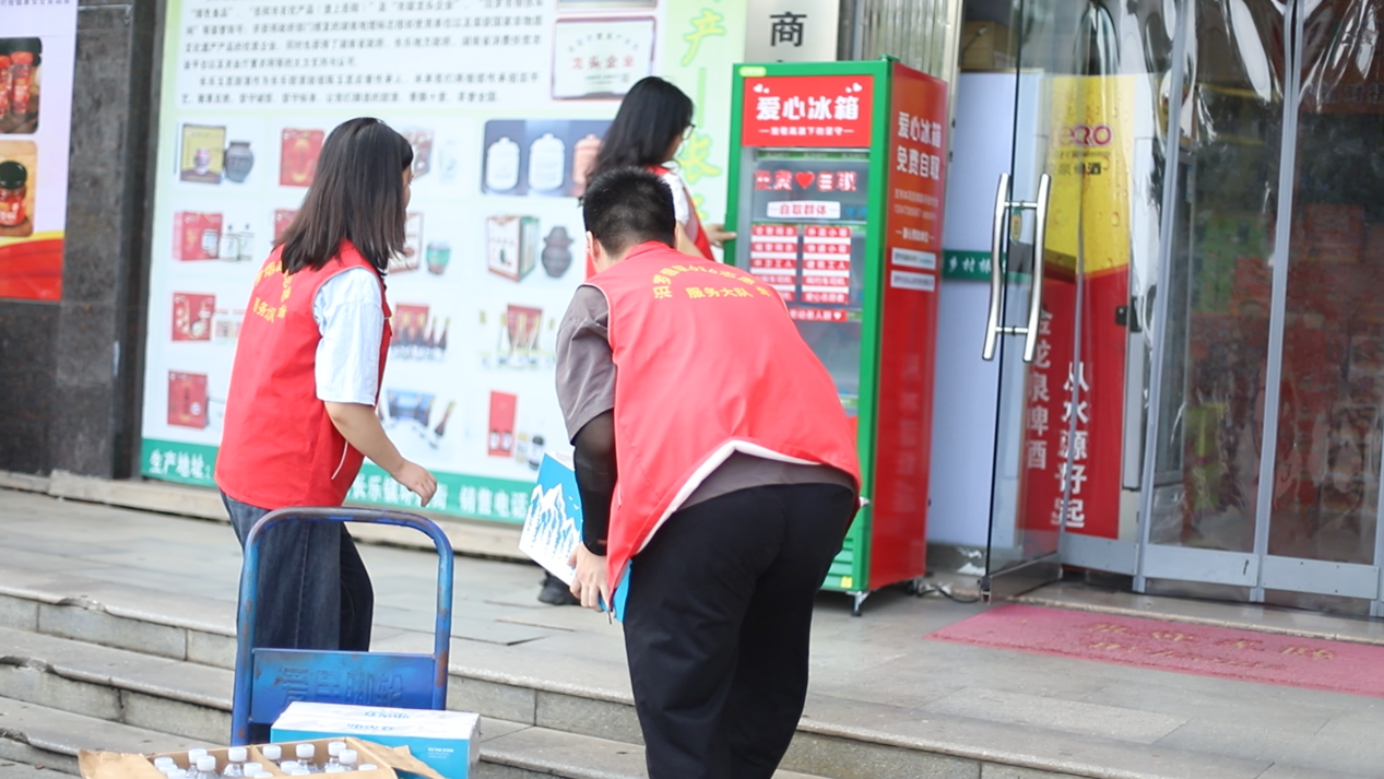 物资发放刚告一段落,刘欣又接到新任务:“伏老板说龙舟看台那边的爱心冰箱水不多了,我们得赶紧补几箱过去。”她一边往车上搬水,一边向同行志愿者说明情况。