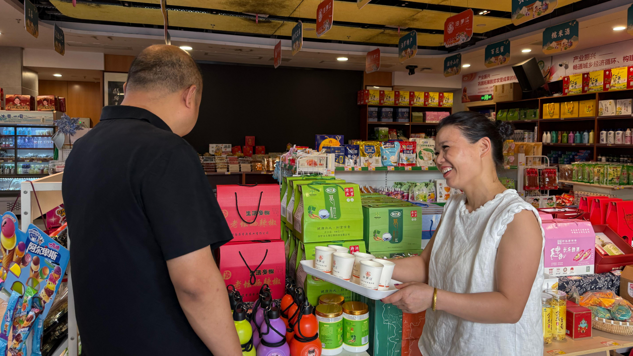 几乎同一时间,位于汨罗江国际龙舟竞渡中心下的乡村振兴馆门前,店主伏坚正弯腰向门口的“爱心冰箱”里补充矿泉水。这个原本普通的零售点,自升级为“爱心驿站”后,已成为不少户外工作者中途休憩的“暖心据点”。