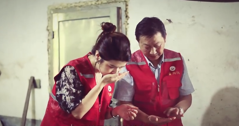 (易清跟公公朱爱保在酒坊查看糟醅发酵情况)