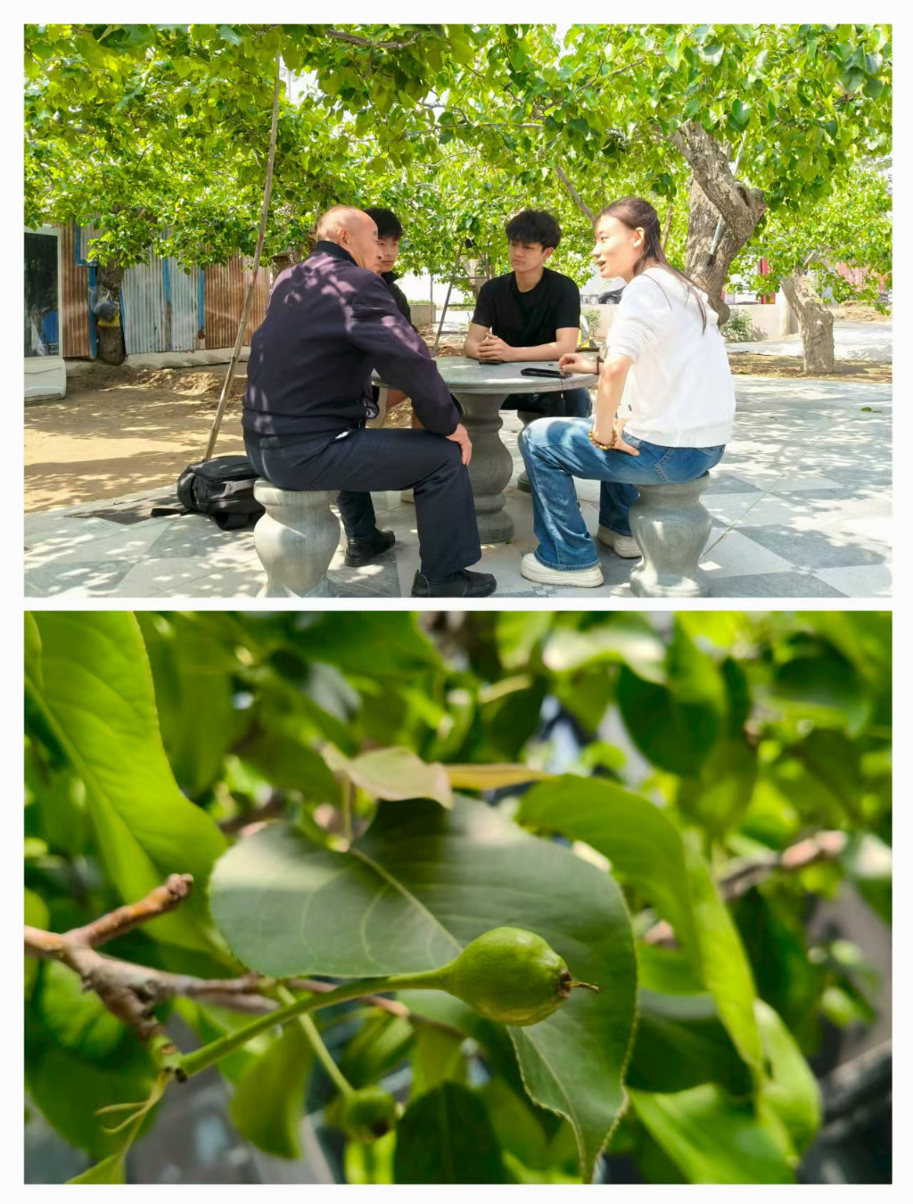 图片为村委在向队员们讲述赵县梨的发展历史