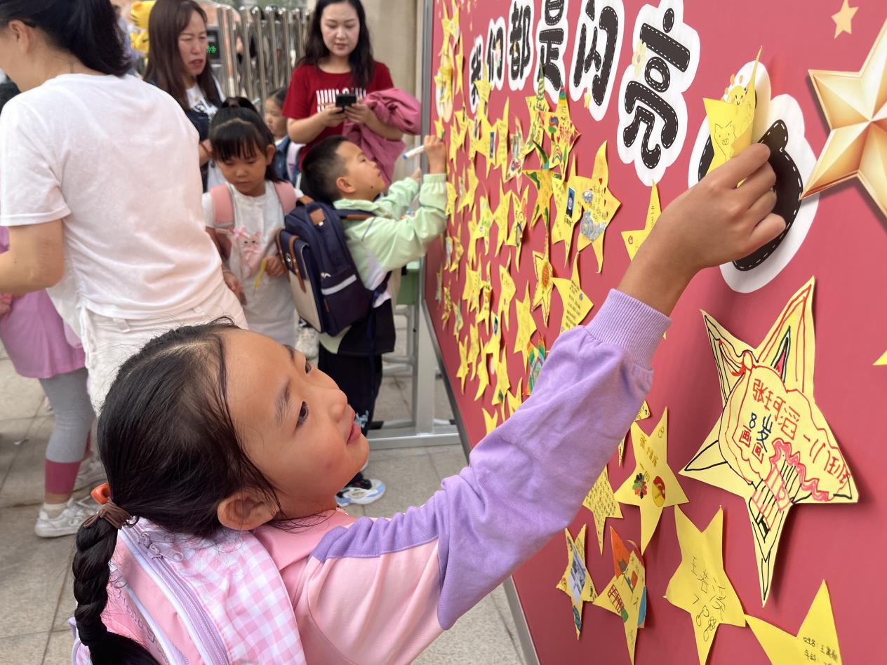 “我们让每一个孩子从入学第一天就成为一颗闪亮的星,”康巴什区第八小学副校长林丽娜介绍道,孩子们在报到日领取星星卡片,设计自己的姓名和爱好,并在入学当天亲手贴在校园展示墙上,增强归属感和仪式感。