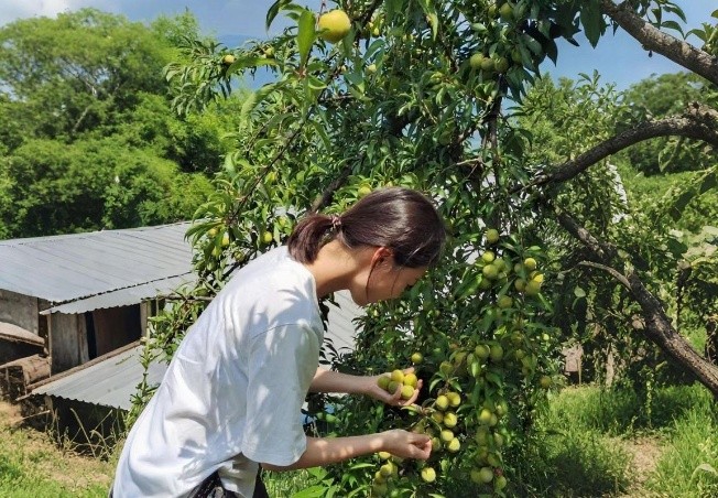 抵达云阳当日,实践队便走进脆李种植园,亲身体验劳苦作乐,感知“金果果”培育采摘不易。在果农黄在树的指导下,队员们戴上手套、拎起果篮,体验脆李采摘。“各位摘得时候记得托着果子转半圈,莫打硬摘,不然会破坏果子的品相,不好卖了。”采摘前,果农黄在树一边为大家示范,一边讲解采摘技巧。在采摘过程中,队员谢娇凤感触颇深,她在日记中写道:“采摘过程并不顺利:会发现深藏果实中的害虫,会可惜因旁边李子腐烂而被“感染”的个大李子,会因为山坡的斜度突然滑一脚而擦伤,还会经历咸咸的汗水从额头流到眼睛里……”烈日下两小时的辛苦劳作,队员们虽汗流浃背,却更加深刻的体会到“粒粒皆辛苦”的含义,也对脆李产业的“致富密码”更添探究欲。