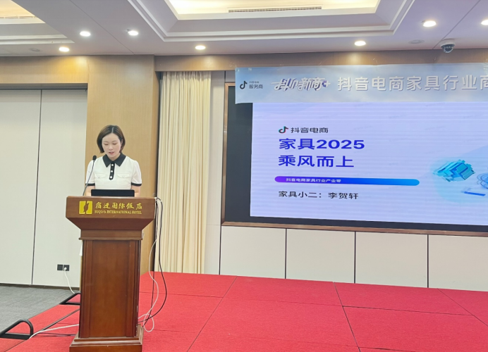 聚焦行业痛点,抖音电商带来“数字化解决方案”。大会现场,抖音电商家具类目运营经理李贺轩围绕“行业趋势、运营玩法、政策扶持、投放策略”四大核心板块展开分享,从家具行业流量分配机制解读到商品卡运营技巧实操教学;从新商家专属扶持政策详解到精准投放策略拆解,每一项内容都紧扣商家经营痛点。在互动答疑环节,参会商家踊跃提问,针对“实木家具直播转化难点”“定制家具商品卡优化”等实际问题,抖音团队现场给出解决方案,赢得阵阵掌声。