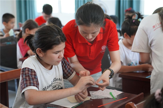 (图2 实践队员在布艺拼贴课上教当地的小孩)