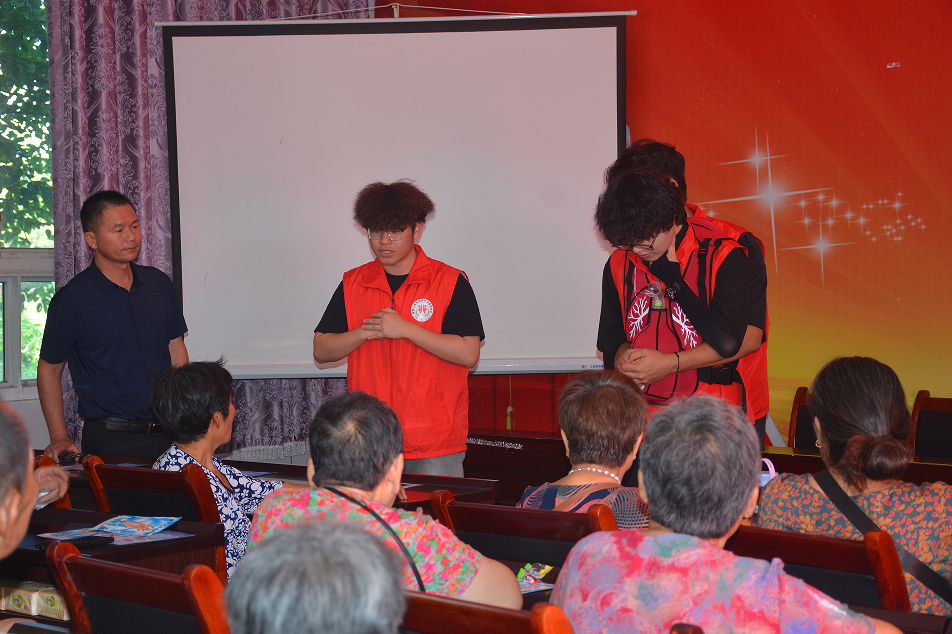 7 月6日,重庆移通学院德擎火盾志愿队在重庆市合川区渭沱镇大岚村开展的 “三防” 进村活动进入第第六天天。这支朝气蓬勃的志愿队伍已经和村民们和谐相处数天,始终贴心守护在村民身边。当天,村委会大会堂内人头攒动、暖意融融,一场融合了专业防溺水急救知识科普与趣味互动体验的防溺水安全专题讲座火热开讲,向村民们教授了心肺复苏,海姆利克急救法等急救知识,为村民们的生命安全“加把锁”
