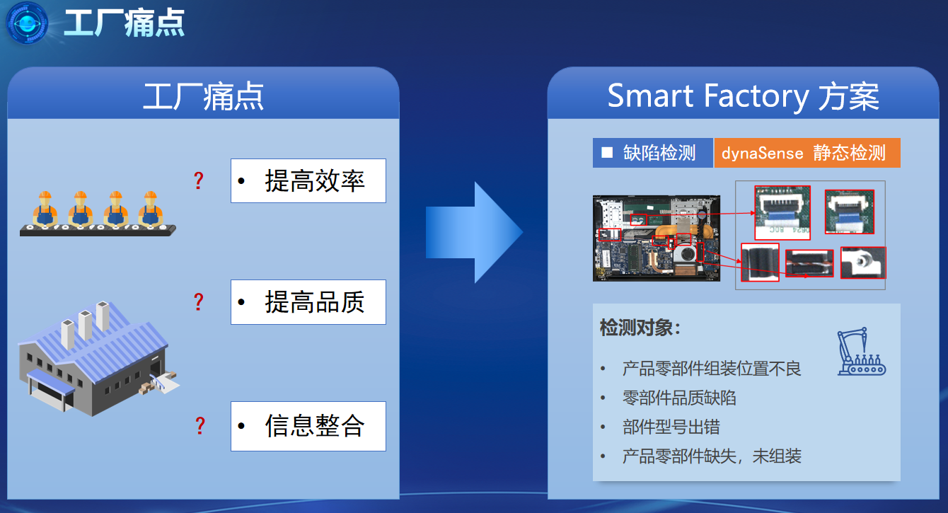 品质是制造类企业立足的根基,而质检则是品质的第一道防线。当前,传统制造企业正深陷检测效率低、精度差、成本高的困境:人工检测漏检率常超5%,一条电子组装产线每日因错检导致的返工成本可达数万元;多品种生产时,检测标准切换滞后,柔性生产沦为空谈;检测数据与生产系统割裂,工艺优化缺乏精准依据…… 面对这些痛点,dynaSense 智慧工厂AI缺陷检测系统以“AI+工业”融合,能基于知识图谱深度学习,练就为眼金睛般的产品缺陷检测技能。