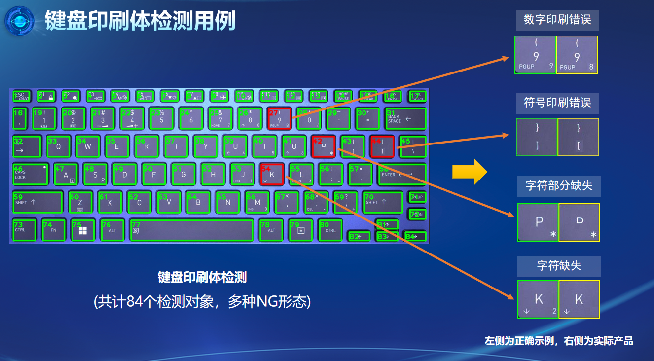 特殊检测:通过专属算法实现跳线颜色顺序、标签印刷内容(如 PC 标签的 “intel vPRO”)、键盘84键印刷错误(含字符缺失、错印)及电池安规标签多语言缺陷检测。