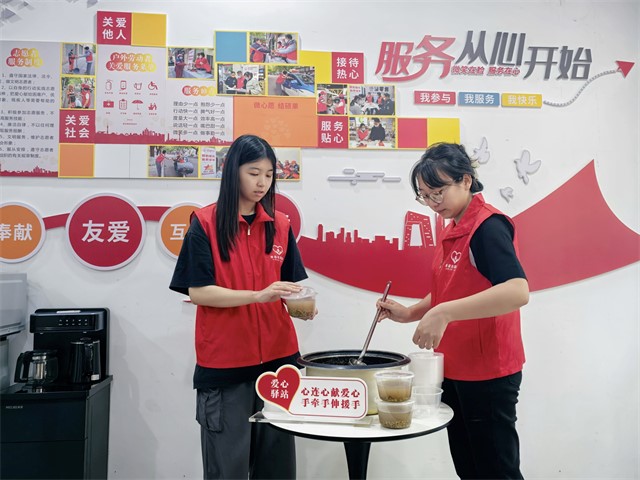 驿站服务角,志愿者周奥淋和马云凤围在汤桶边,手中的长勺搅动着碧绿的绿豆汤。他们把对户外劳动者的牵挂,融进舀汤、递碗、唠家常的动作里,用贴心话讲清绿豆汤 “清热解暑、补充体力” 的用意 。这一 “带着豆香情” 送清凉,让清凉慰藉顺着汤水流进户外工作者喉间,既为街头奔忙的辛劳降了 “暑气值”,更让驿站是温暖补给站的想法印在劳动者心里。