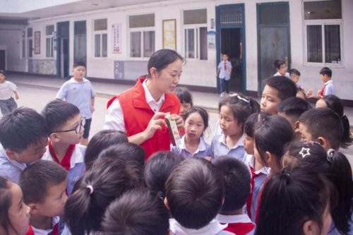 图为“香溢”志愿者赵仙红在小学校园中做普法宣传