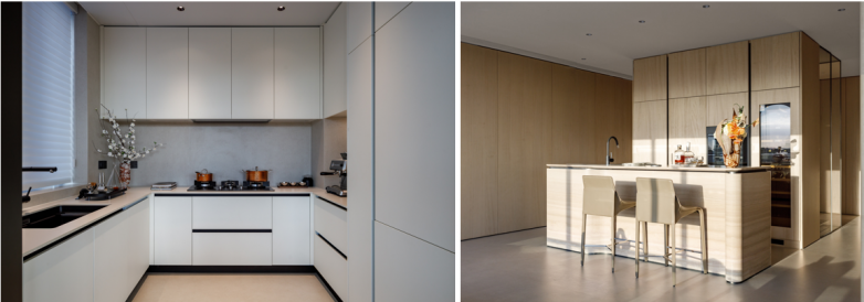基于对宁波居民海鲜饮食文化的洞察,柏厨家居创新设计双冰箱格局,中厨区专注生鲜处理,西厨区负责饮品轻食,避免串味和交叉污染。西厨区域更成为家庭的社交心脏,搭配智能升降插座、阻尼抽拉层板、上翻平移柜门等功能五金,在极致简约中深藏人性化巧思,于克制中实现功能与美学的平衡。