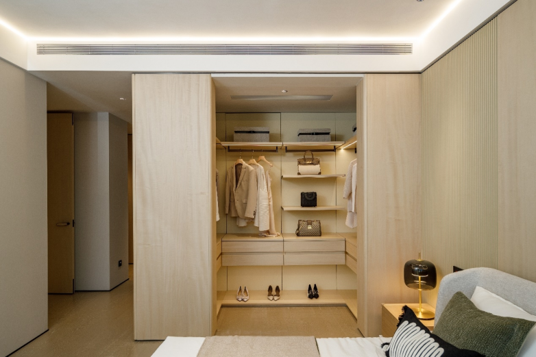 突破传统主卧空间仅是床与柜的简单组合模式,柏厨家居通过整屋木饰面系统、通高隐形收口系统及毫米级追缝工艺打造出连续、纯净的界面语言。木的温润质感与灯光、格栅搭配,形成细腻的光影秩序,不仅在视觉上提升整体性,更从环境心理学角度使人体皮质醇水平下降,为居者营造助眠氛围。