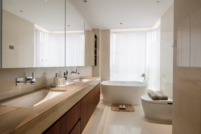 远离过度石材堆砌的豪装逻辑,柏厨家居选用微水泥与实木贴皮工艺混搭,采用9°-15°哑光漫反射体系,通过悬浮式叠级灯光与玻璃的折光效应,形成类露天汤泉的感官减压场域,构筑出空灵、宁静的洗浴体验。空间回归材质本身的纹理与触感,传递出安缦美学中“真正的奢侈,是呼吸的自由”。