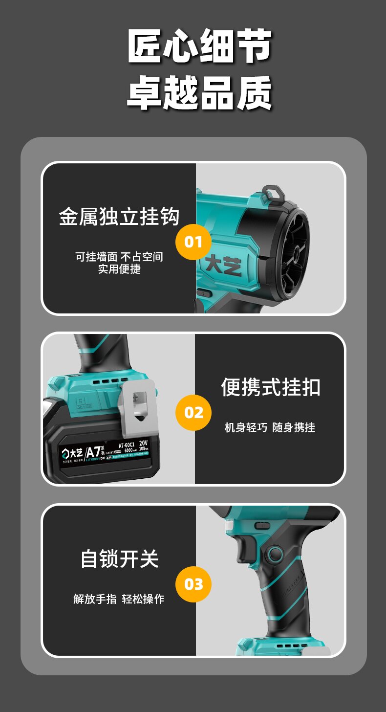 细节成就品质。 大艺20-215锂电无刷吹尘枪具备记忆挡位功能,再次开机时可自动恢复上次使用设置,无需重复调节,显著提高作业效率。4挡风速调节与一键锁定开关设计,满足不同清洁需求。配备多种吹嘴配件,支持免工具更换,操作简便,适用于多样场景。金属独立挂钩与便携式皮带扣设计,方便随用随挂,极大提升了移动工作的便利性。
