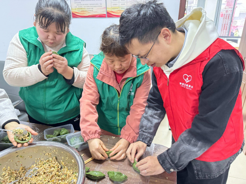 图为“香溢”志愿者陈浩与残疾人之家人员共同包清明粿 毛梦萍 摄