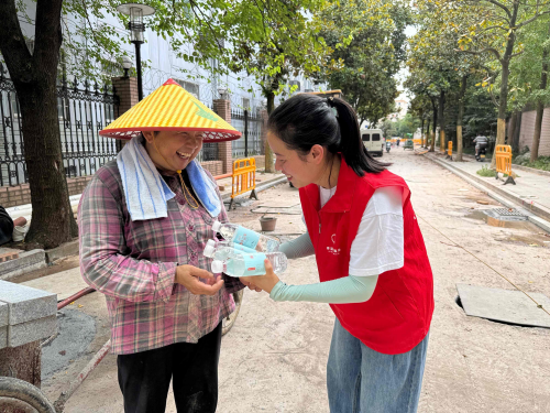 图为“香溢”志愿者吴幸玲给户外劳动者送上矿泉水 毛梦萍 摄