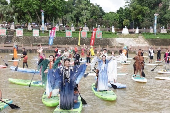 活动中,黎苗传统纺染织绣技艺与现代水上运动完美结合,非遗文化以生动有趣的方式呈现在公众面前。而哪吒、敖丙脚踏动力冲浪板的炫酷表演,则为这场文化盛宴注入了全新的国潮活力。